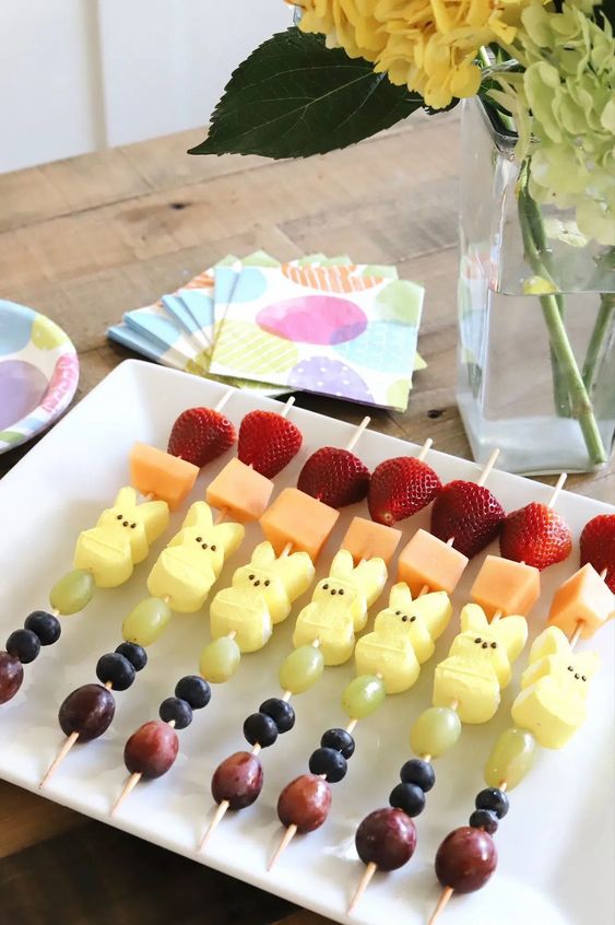Elevate your Easter celebration with vibrant and refreshing fruit kabobs that offer a burst of color and flavor to your dessert spread. Skewer a delightful assortment of fresh fruits such as juicy strawberries, sweet pineapple chunks, ripe mango slices, and tangy kiwi cubes onto bamboo skewers, creating a stunning display of natural beauty.