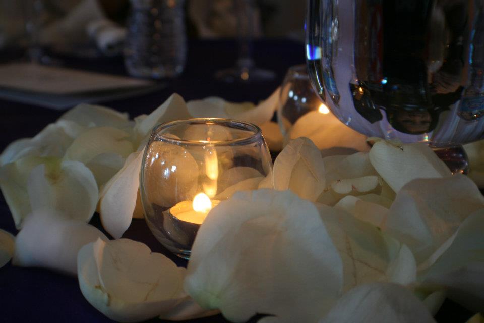 Centerpieces: I initially planned for fancy floral arrangements, but planning your own wedding can take a toll on you, and costs add up quickly. So, I opted for what the venue offered in their package: floating candles in glass vases and fresh rose petals. It still made my photos look good and gave the elegance and simplicity I was looking for.